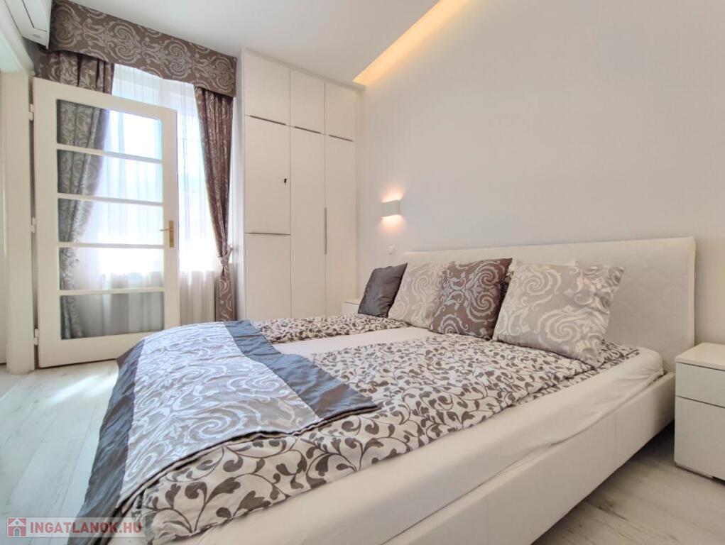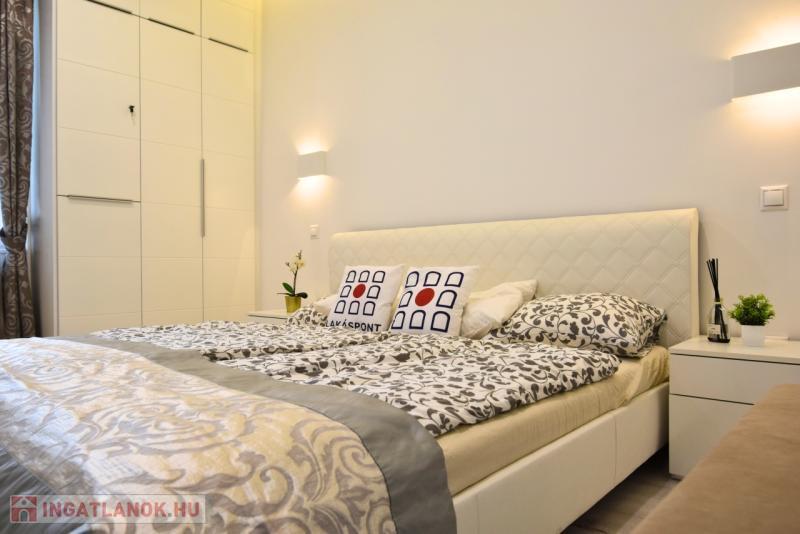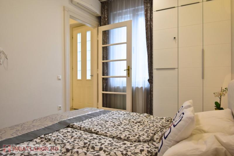 A csendes udvarra néző hálószoba teljesen külön nyílik, beépített gardrób szekrénnyel.