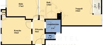 A nappali kb. 30 nm, ebből nyílik a külön bejárattal is rendelkező háló, ami kb. 16 nm.