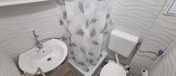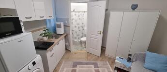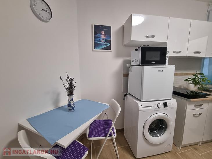 Gépesített konyha teljesen új készülékekkel: hűtő, mikrohullámú sütő, indukciós főzőlap.