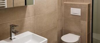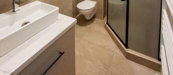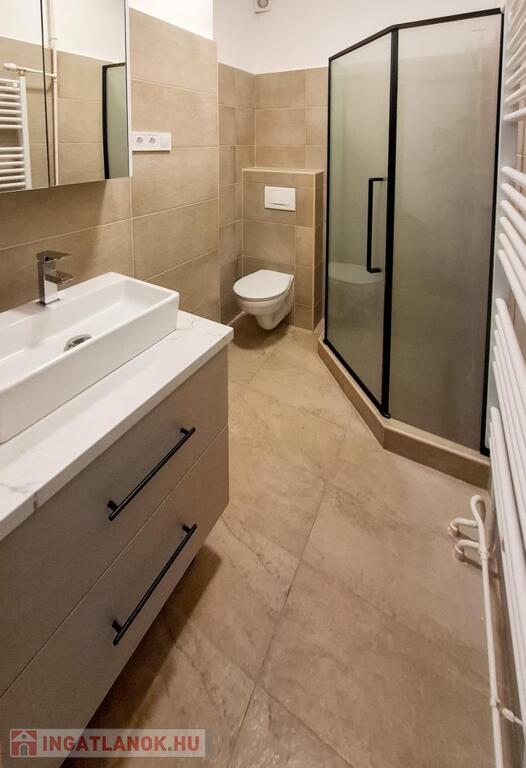 A felújított fürdőszoba modern szaniterekkel és letisztult megjelenéssel rendelkezik.