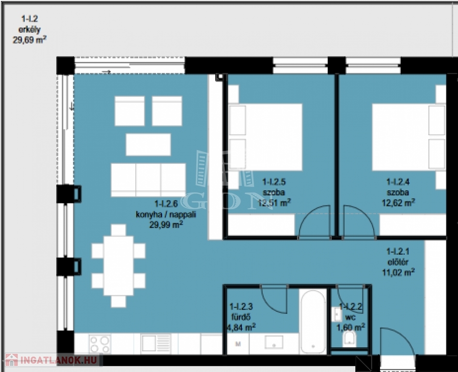 A LAKÁS az első emeleten található. 73 nm lakótér, 30 nm terasz. Amerikai konyhás nappali, 2 hálószoba, fürdőszoba, WC.