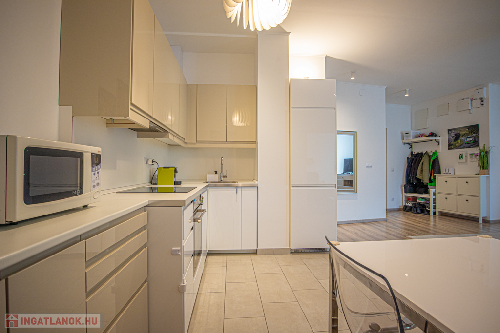 Eladó a 2019-ben épült Tópark Be My City Lakóparkban egy IV. emeleti (legfelső emelet), amerikai konyhás nappali + 2 hálószobás, gardróbos, nagy fürdőszobás, újszerű állapotban lévő, remek beosztású, csendes, nyugodt lakás.