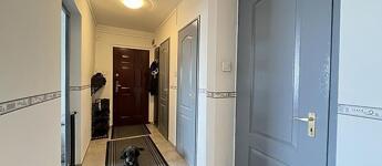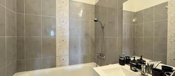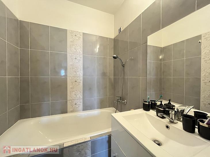 A fürdőszoba új burkolatot kapott, kádas. A mosógép be-és kiállása a gardróbszobába lett kialakítva.