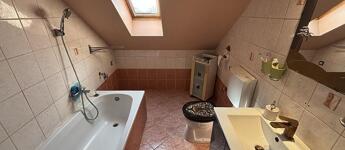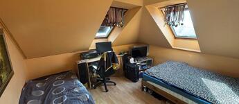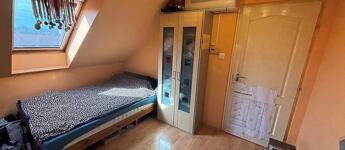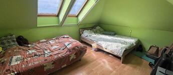 A tetőteret 2005.-ben beépítették, Br.: 41nm, N.: 23nm, 2szoba, fürdőszoba + WC, előszoba helyiségekből áll. Az ablakok VELUX fa típusúak, gyártott, külső rolós és belső árnyékolóval. A szobák laminált parkettások, a többi helyiség járólapos.
