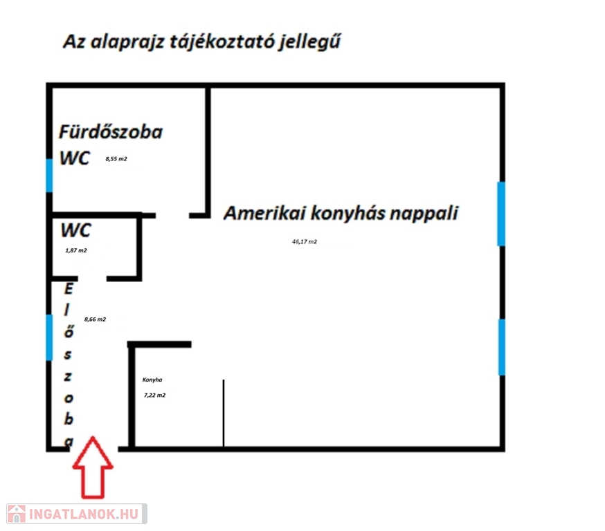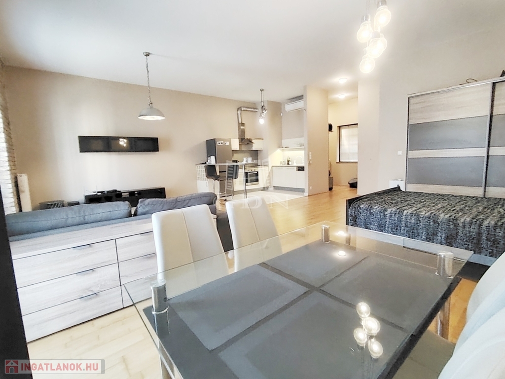 BEOSZTÁS: a tágas előszobából szemben, külön WC, külön fürdőszoba-WC, amerikai- konyhás nappali-hálószoba egy légtérben, francia erkély.