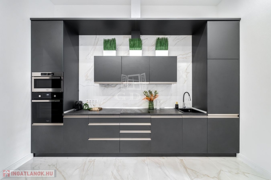 A lakás világos, tágas terekkel, egyedi belsőépítészeti megoldásokkal és magas minőségű bútorzattal, beépített gépekkel várja új tulajdonosát.