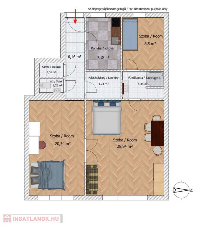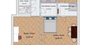 A lakás elrendezése ideális: két nagy, utcára néző szoba és egy csendes, udvarra néző félszoba biztosít kényelmes életteret. A 3,6 méteres belmagasság, a napfényes terek és a külön nyíló helyiségek tágas, elegáns hangulatot teremtenek.