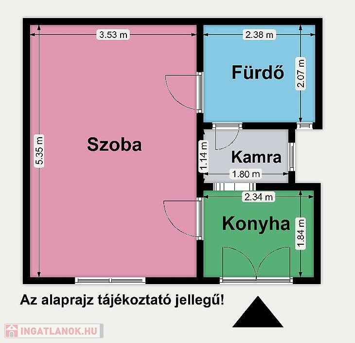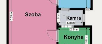 A lakás praktikus elosztású: egy szoba, konyha, fürdőszoba és kamra található benne.