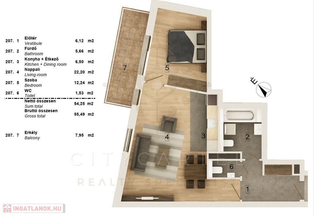 A liftes társasház 2. emeletén található, 58,23 nm-es, (54,25 nm lakás 7,95 nm terasszal) 2 szobás lakás korszerű hőszivattyús fűtés–hűtéssel és teljes körű okosotthon-rendszerrel felszerelve várja új tulajdonosát. A burkolatok még választhatók, így a leendő tulajdonos saját ízlésére szabhatja az ingatlant.