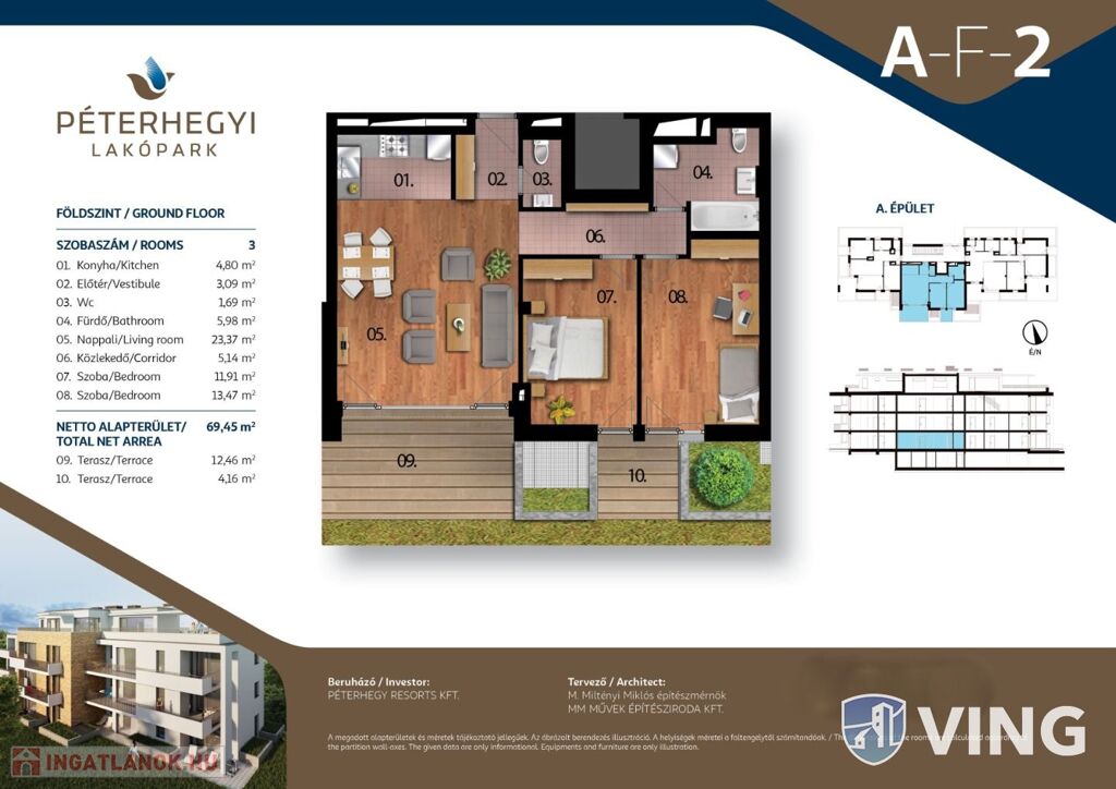 A hirdetésben szereplő lakás a A épület földszintjén található, amerikai konyhás nappali +2 hálószobás elrendezésű.