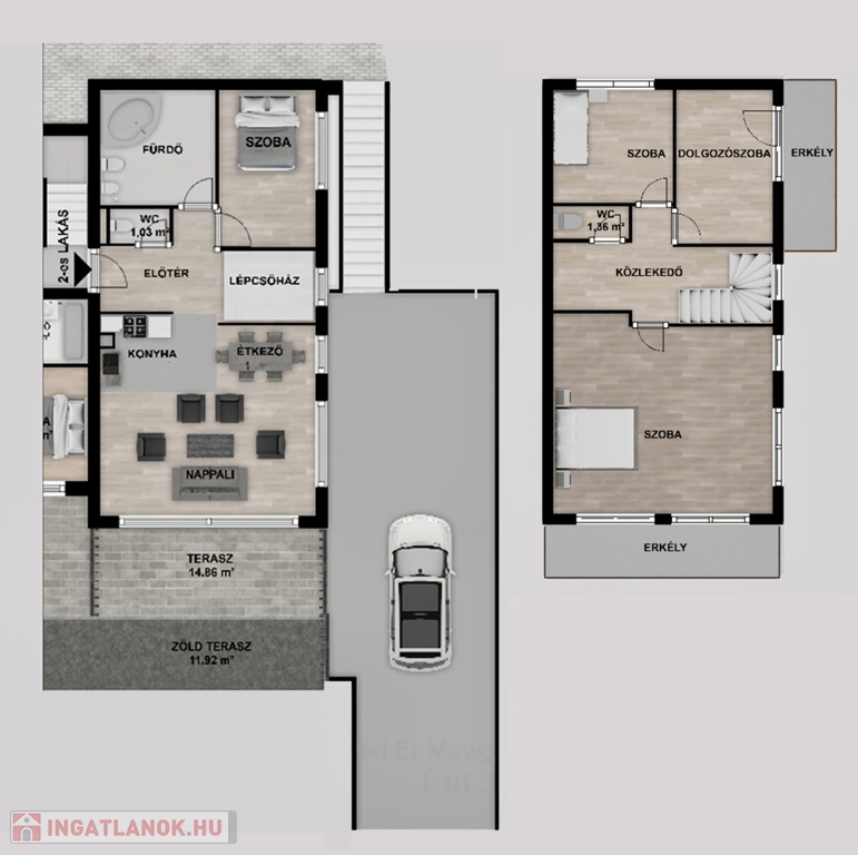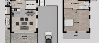 A földszinti, belső kétszintes lakás beosztása: az alsó szinten amerikai konyhás nappali közvetlen terasz- és kertkapcsolattal, hálószoba, mellette kádas fürdőszoba wc-vel, külön vendégmosdó; az emeleti szintre kényelmes lépcsőn jutunk fel, itt három külön nyíló, jól bútorozható hálószoba, amelyek közül kettő erkélykapcsolatos; zuhanyzóval felszerelt fürdőszoba WC-vel.