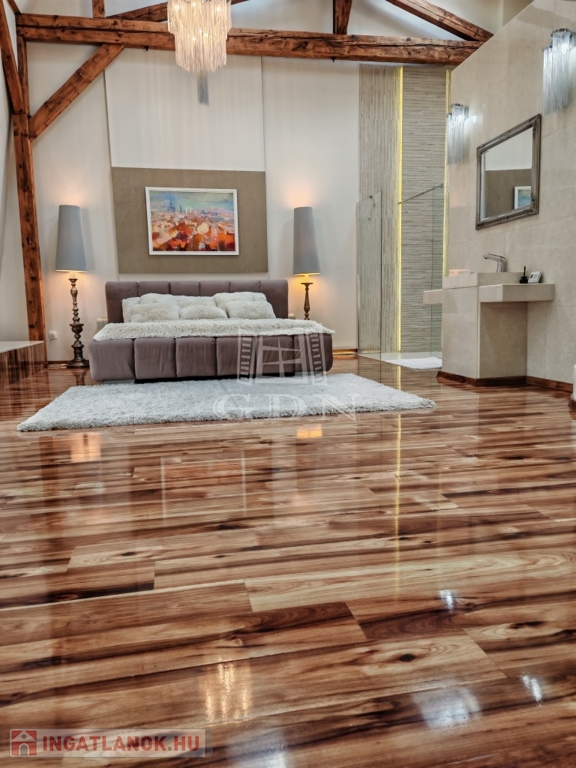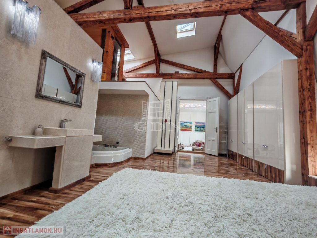 Az ingatlan éke amitől garantáltan el áll a lélegzete....a szint eltolással kialakított, 5 méteres belmagasságú hálószoba aminek a tetején ablakok vannak így akár ágyból is láthatjuk a csillagos eget vagy ébredhetünk arra,hogy a hasunkra süt a nap!