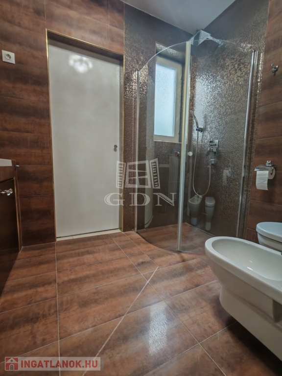 Gardróbhelyiségből nyíló fürdőszoba, amely zuhanyzóval, WC-vel és bidével felszerelt.