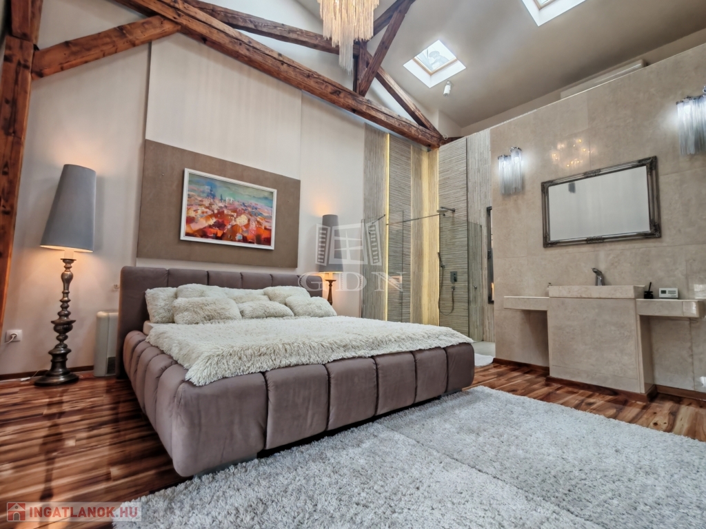 Ebből a különleges hangulatú hálószobából belső személyi lift visz fel az infraszaunához. Innen néhány lépcsővel elérhető a fából kialakított tetőterasz csodás panorámával. Tűzijáték páratlan élményt nyújt innen!
