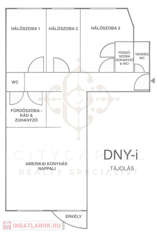 Amerikai konyhás nappali + 3 hálószoba + 2 fürdőszoba + vendég WC + erkély