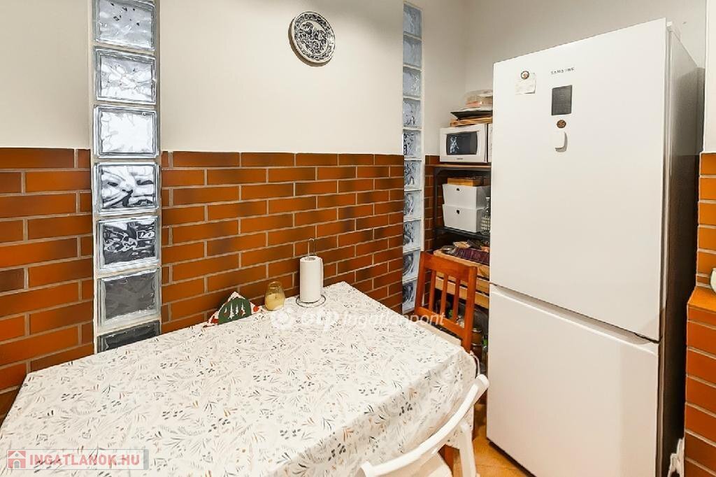 A korábbi átalakításoknak köszönhetően a konyhai területéhez egy praktikus étkező is kapcsolódik. Konyhája újszerű, IKEA-ás konyhabútorral beépítve.
