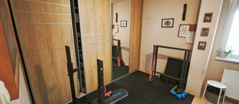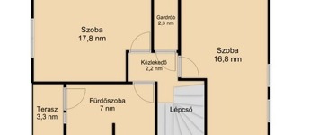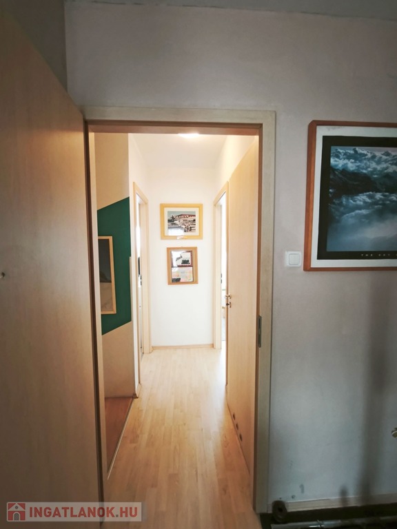 A felső szintre vezető lépcsőn a 2,2 nm-es közlekedőbe érkezünk, amiből jobbra nyílik a 16,8 nm-es laminált parkettás szoba, amit egy 2,3 nm-es jól kihasználható gardrób választ el a balra lévő 12,5 nm-es szintén laminált parkettás hálószobától.