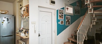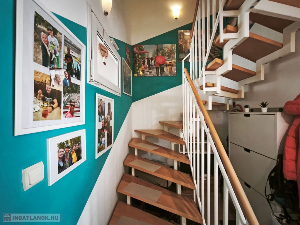 A lakás a biztonsági ráccsal ellátott folyosó végén helyezkedik el. A bejárattal szemben található egy saját 1,5 nm-es beépített külső tároló. A folyosó utolsó lakásaként a szintén biztonsági ráccsal védett bejárati ajtón belépve az alsó szinten a nagyon tágas 30 nm-es ízlésesen berendezett klímás, amerikai konyhás, nappaliba érkezünk, ami kényelmes teret biztosít a család mindennapi életéhez, közös időtöltéséhez. A konyha gépesített, ablakos , modern, bútorozott.