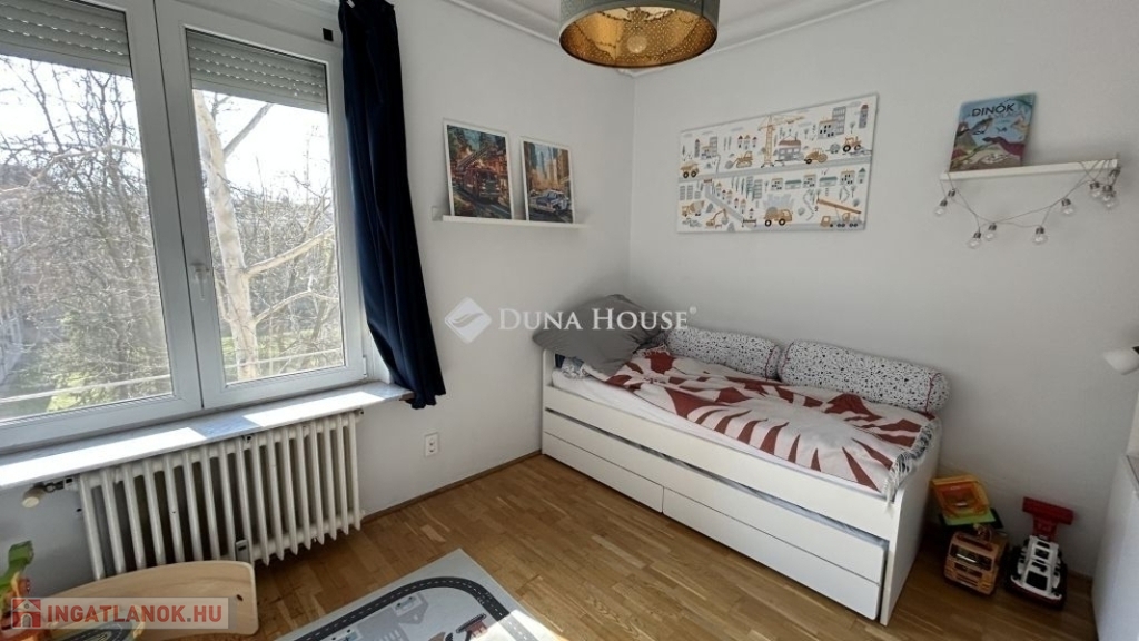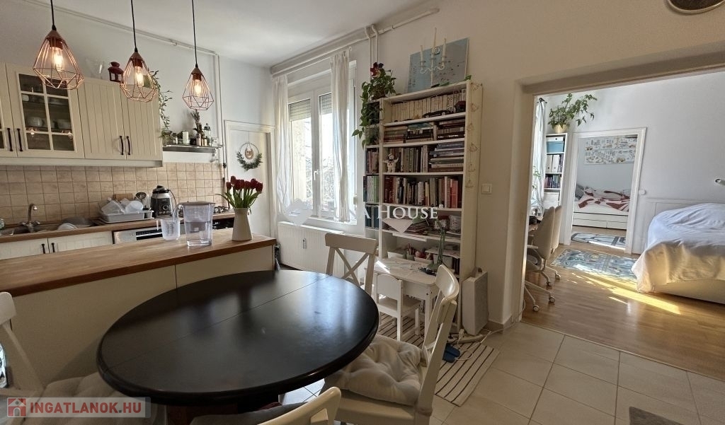 A napfényben fürdőző lakás zöld kertre néző, praktikus kialakítású, tágas terekkel, megkímélt állapotban. Az amerikai konyhás nappali mellett 2 szoba, külön fürdő és toalett, egy kamra és előszoba alkotja.