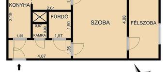 Előszoba, L alakú étkezős konyha, nappali, hálószoba, kádas fürdőszoba, kamra áll rendelkezésre. A nyílászárók 5 éve műanyag, hőszigetelt ablakokra és biztonsági ajtóra lettek cserélve. Az ablakok redőnnyel és ráccsal ellátva, egy része szúnyoghálós is. A villanyvezetékeket rézre váltották. A fűtés gázcirkóval biztosított lapradiátorokon keresztül. Tartozik a lakáshoz egy 4 nm-es zárható tároló. A szobák ablakai a parkosított udvarra nyílnak.
