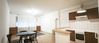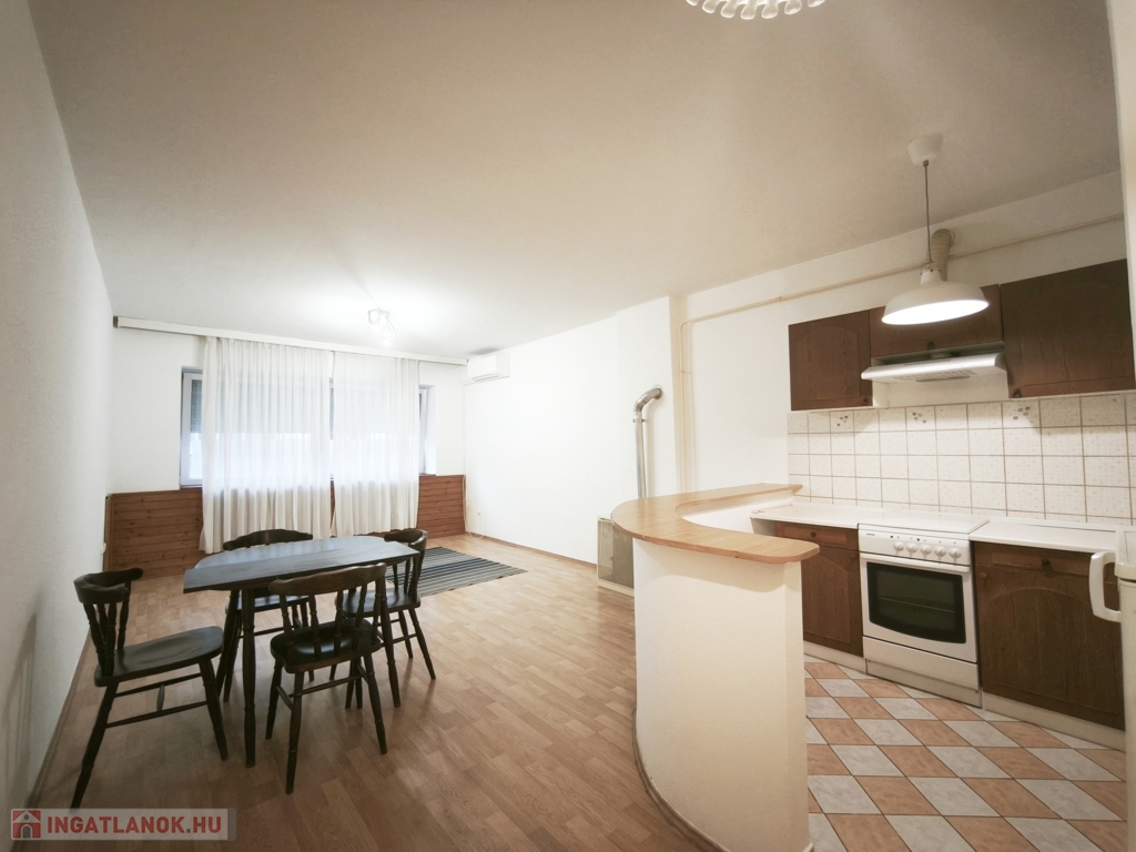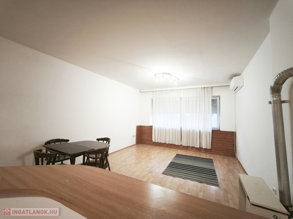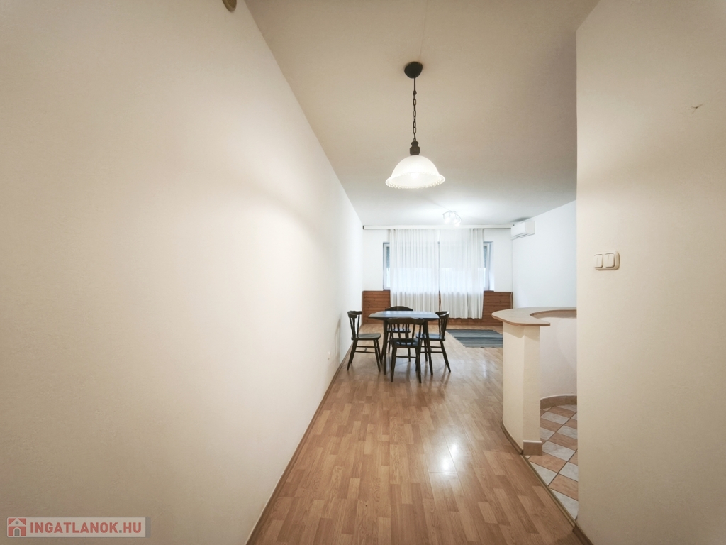 A társas házban a lakóközösség tagjai barátságosak, segítőkészek, a lakás kiváló elhelyezkedésű, frekventált helyen található. A lakás K-i fekvésű, földszinti elhelyezkedése ellenére is kellően világos. Az utcáról kocsival elektromos kapubejárón keresztül jutunk be a zárt közös udvarba, ahol minden tulajdonos számára van lehetőség parkolni. A zárt lépcsőházon keresztül érkezünk a közös folyosóra ahonnan a jó minőségű fa ajtón keresztül jutunk a lakásba. Belépve az előszobával szemben a kádas fürdőszoba nyílik, amiben a toalett is helyet kapott. Balra fordulva a közlekedőből a tágas gépesített, amerikai konyhás, ebédlős nappali tárul elénk. Ebben a nagy térben jobbra a konyhai részt egy félkör alakú pult választja el, ami előtt egy étkező asztal is bőven elfér, szolgálva a komfortos étkezést a család számára. A nagyon tágas helységben, bőven marad hely a pihenésre szánt nappali rész kialakítására is. A szoba a mellékutcára néz ennek ellenére csendes, világos. A lakásban a két éve beépített klíma szolgálja a komfort érzetet nyáron.