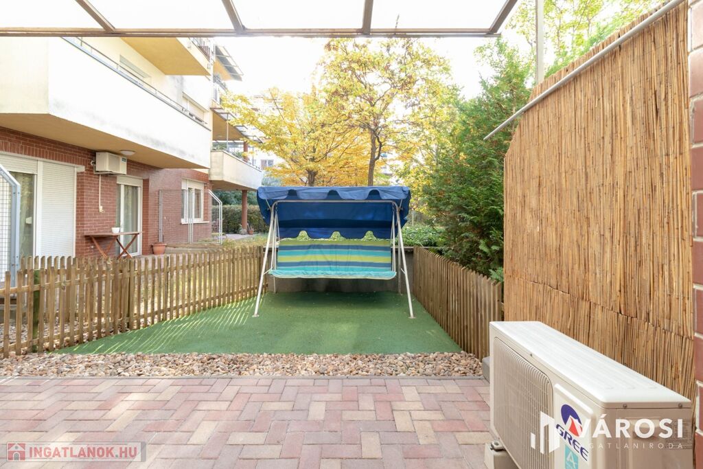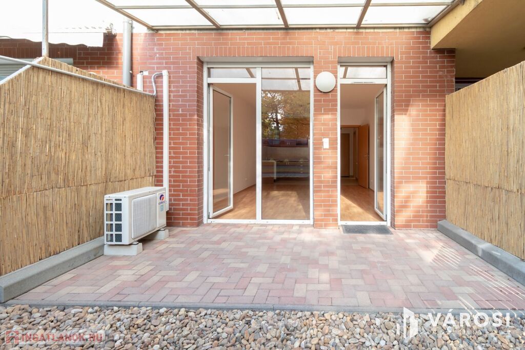 Különlegessége a nappaliból közvetlenül nyíló 9,5 m2-es, kövezett terasz és az előtte lévő 10 m2-es, műfüves, saját kiskert, melynek köszönhetően ez az ingatlan egy igazi kis oázis, egy valódi kis személyes sziget.