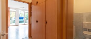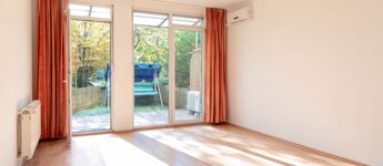 A nappali és az előtte lévő terasz és kiskert a délnyugati tájolásnak köszönhetően világos, napfényes, miközben a Gree típusú klíma gondoskodik a benti kellemes hőmérsékletről.