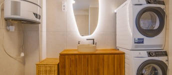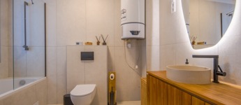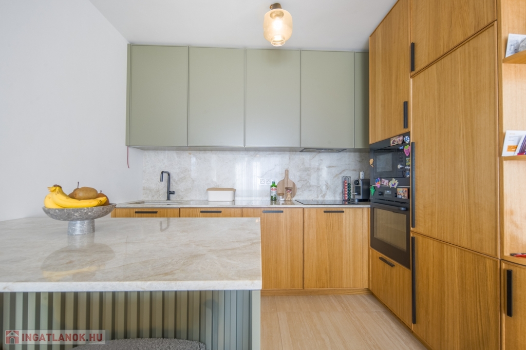 A 7 m2-es fürdőszoba kádas, ablakos, a WC-vel egy helyiségben, a konyhabútor teljesen egyedi építésű, beépített gépekkel együtt az ár részét képezi.