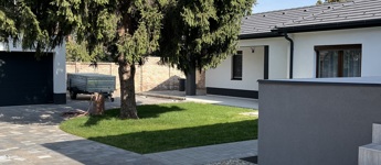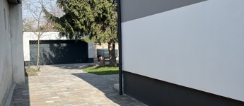 térkövezett udvar, gondozott zöldfelület