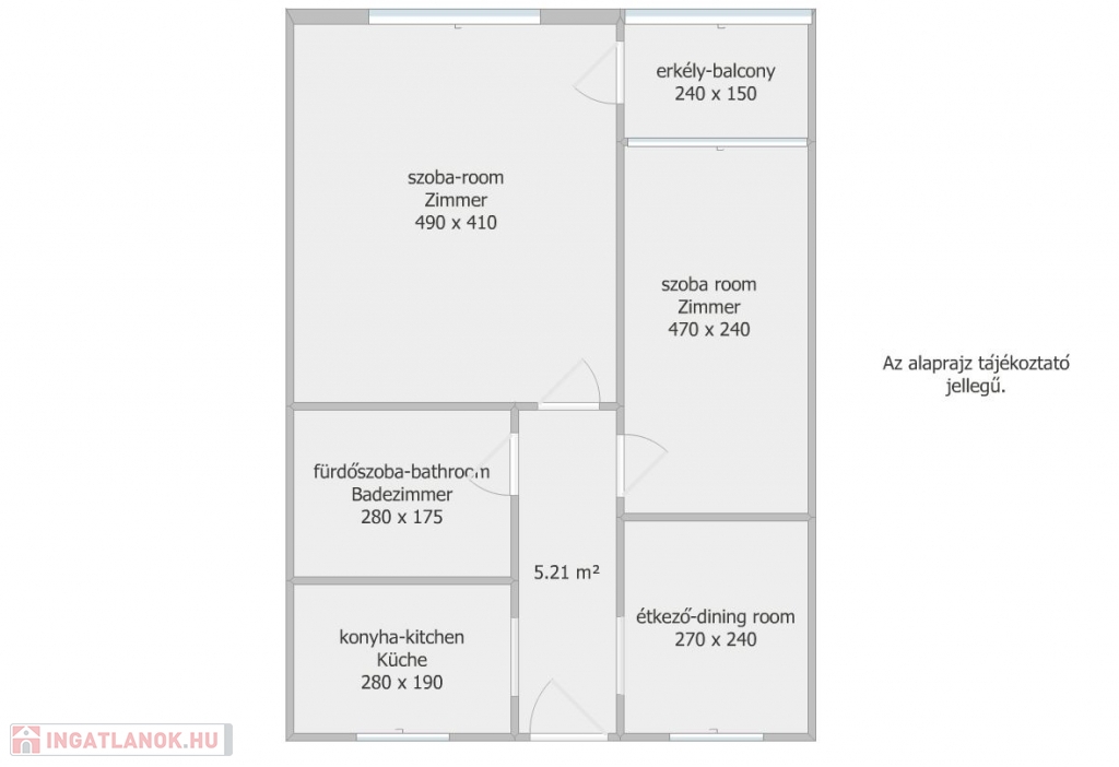 Helyiségei: a két szoba mellett, egy félszoba méretű étkező/félszoba, konyha, fürdőszoba, loggia, gardrób.