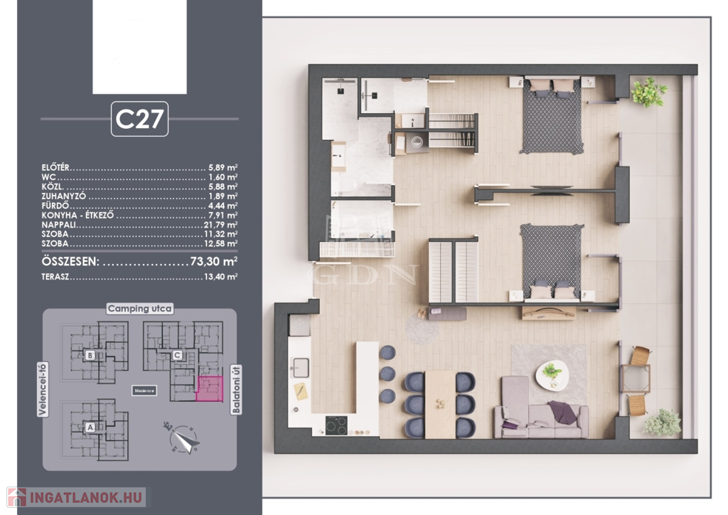 Gárdony Agárdi városrészének központjában, a Balatoni út és a Camping út határolta 3814 m2 területen, a volt Nádas étterem helyén épülő Agárd-Lux projekt társasház "C" jelű épület 2. emeletén található déli tájolású lakás. Közvetlen közelében található posta, vendéglátóhelyek és különböző kereskedelmi egységek. 200 méterre található a vasútállomás, ahonnan vonattal könnyen elérhető Székesfehérvár és Budapest. A Velencei-tó 300 méteres távolságban van, itt a horgászat és a vízi sportok kedvelőinek lehetőségük van a tartalmas időtöltésre. Agárd távolabbi részén található a Termálfürdő, ahol a wellness mellett gyógyulási szolgáltatások is elérhetőek. A lakások modern komfort és prémium minőségűek, alapfelszereltségéhez tartoznak a helyiségenként felszerelt fűtésre optimalizált hőszivattyús klímák és az alumínium redőnyök előkészítése is. Az átadás időpontja 2025 második fele. Érdeklődés esetén időpont egyeztetése bármikor. Megtekintés munkaidőben, a jelenleg folyó kivitelezési munkálatok miatt.