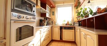 A konyha, egyedi tervezésű konyhabútorral és minőségi gépekkel.
