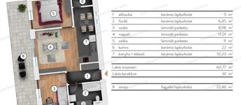 - lakótér: 60,77 m2 + 22,46 terasz