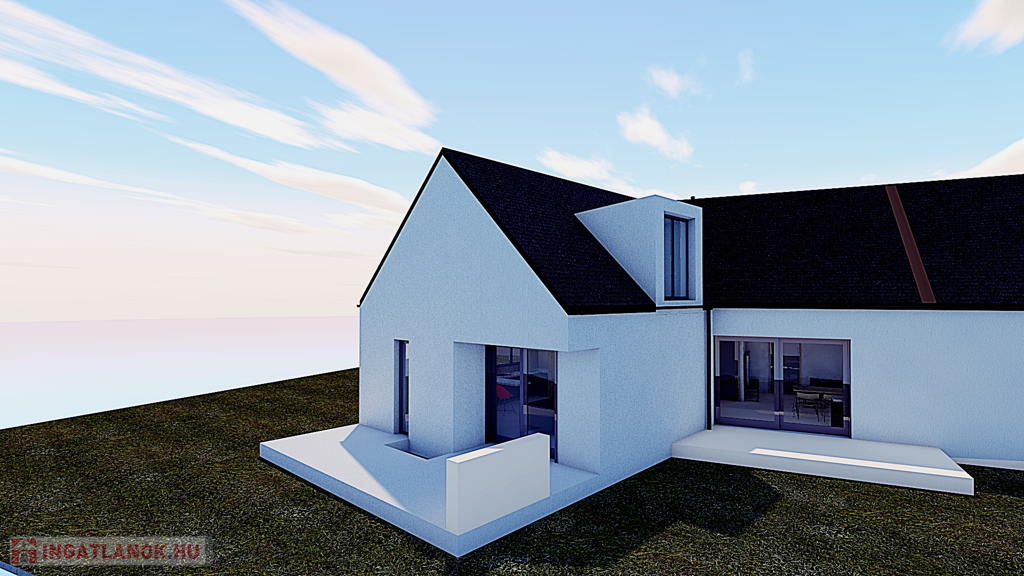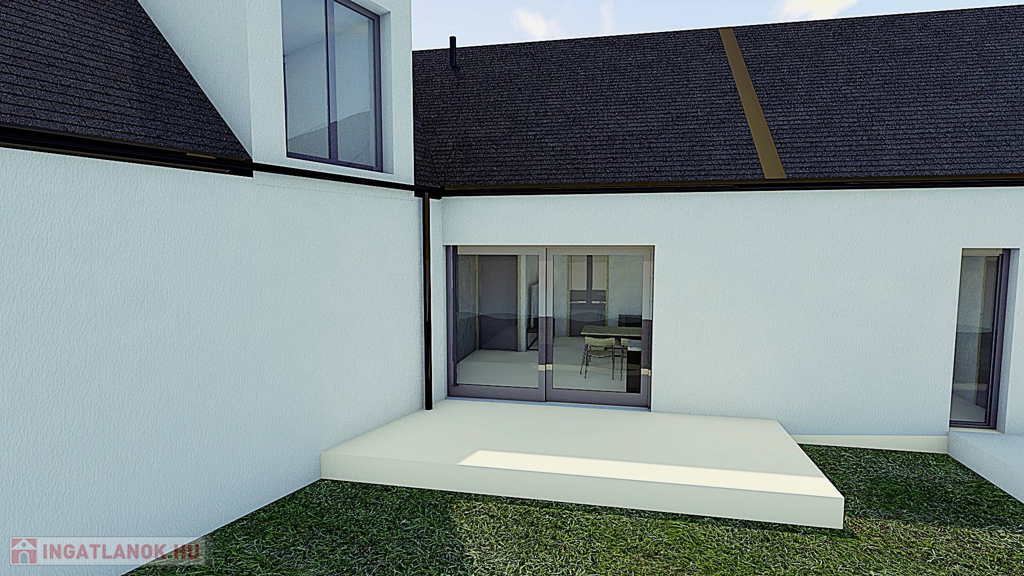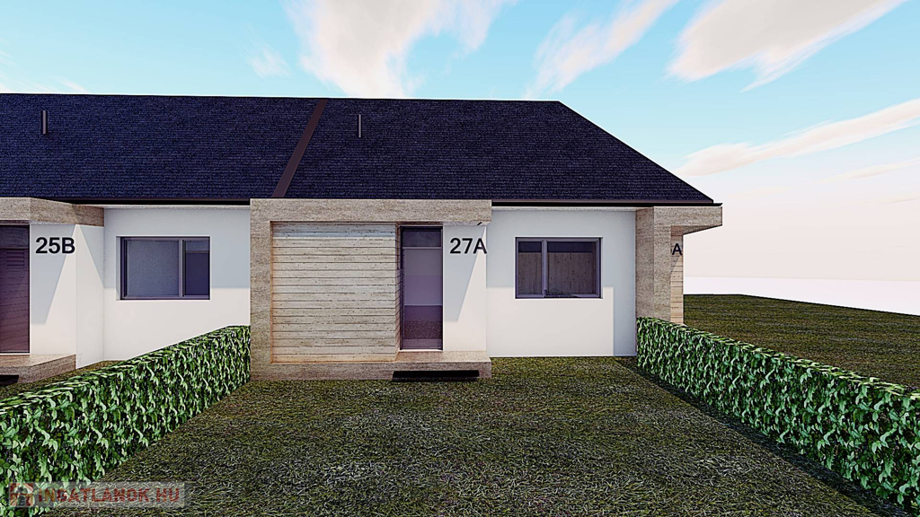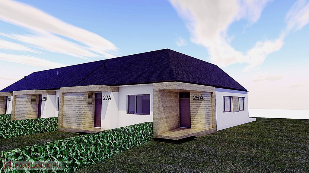 A termálfürdő közelében, új lakóparkban, 2025-ben épülő, zártsorú beépítéses, 2 lakásos, külön bejáratú ház egy 424 m2-es telken fekszik.