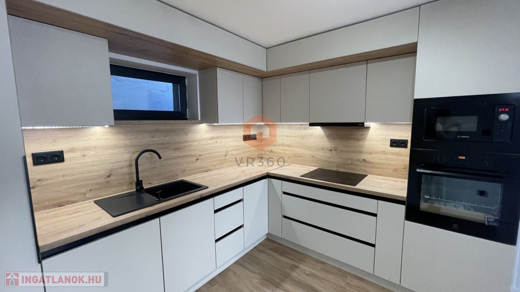 -teljesen gépesített amerikai konyhás nappali, beépített sütő, indukciós főzőlap, elszívó, beépített hűtő, mosogatógép, hűtő-fűtő klíma, különleges világítás technika,