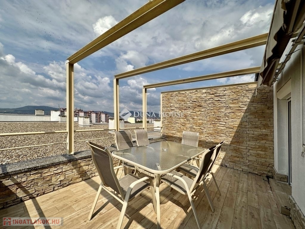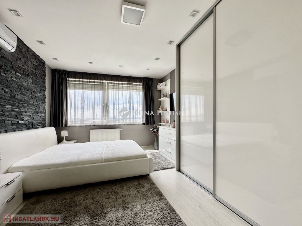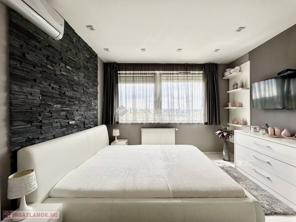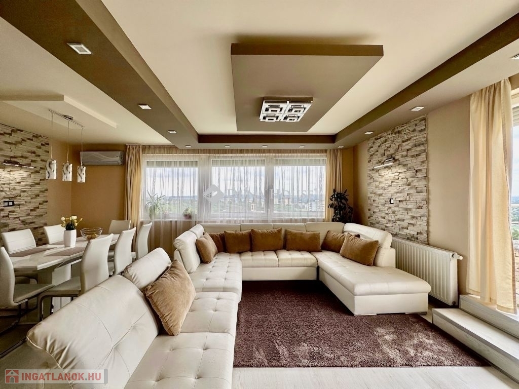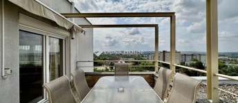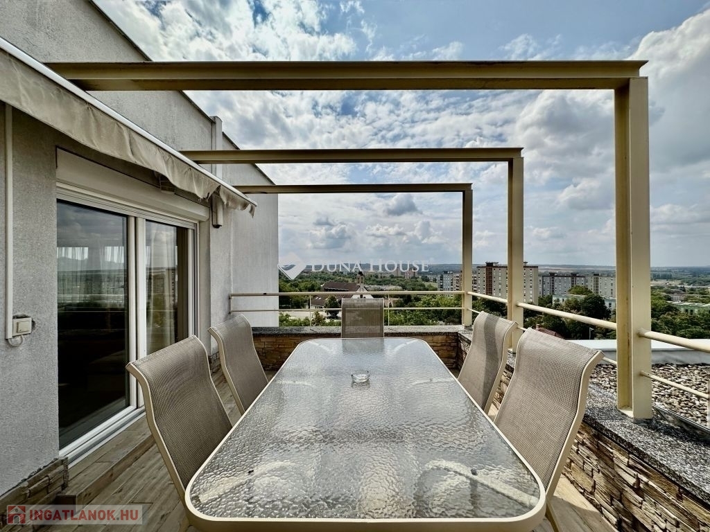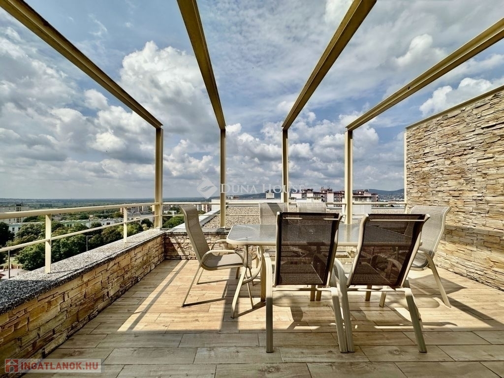 Eladó panorámás, modern lakás tetőterasszal Fellbach lakópark, PécsExkluzív lehetőség a közkedvelt Fellbach lakóparkban: eladásra kínálunk egy kiváló elrendezésű, világos, modern kialakítású téglalakást, páratlan kilátással a Mecsekre. Az ingatlan egy lifttel ellátott társasház legfelső szintjén található, igényes, rendezett környezetben.Főbb jellemzők:Tágas amerikai konyhás nappaliNagyméretű tetőterasz elektromos árnyékolóvalKét külön nyíló hálószobaFürdőszoba + külön WCMinden helyiség klimatizáltSaját, zárható tárolóTávfűtés egyedi mérővelParkolás közvetlenül az épület előtt, mindkét irányból megközelíthetőenA lakás modern burkolatokkal, stílusos belsőépítészeti megoldásokkal, kiváló természetes fényviszonyokkal rendelkezik. Ideális választás azok számára, akik igényes, jól megközelíthető, nyugodt környezetben keresnek prémium ingatlant. További információért és megtekintésért keressen bizalommal!
