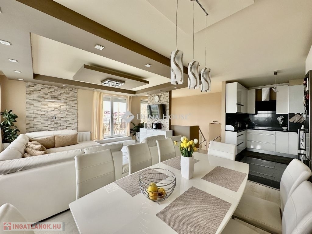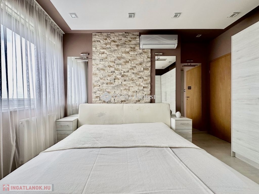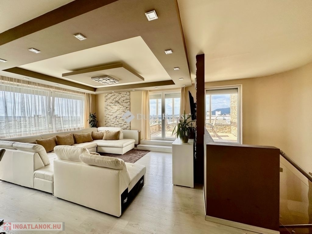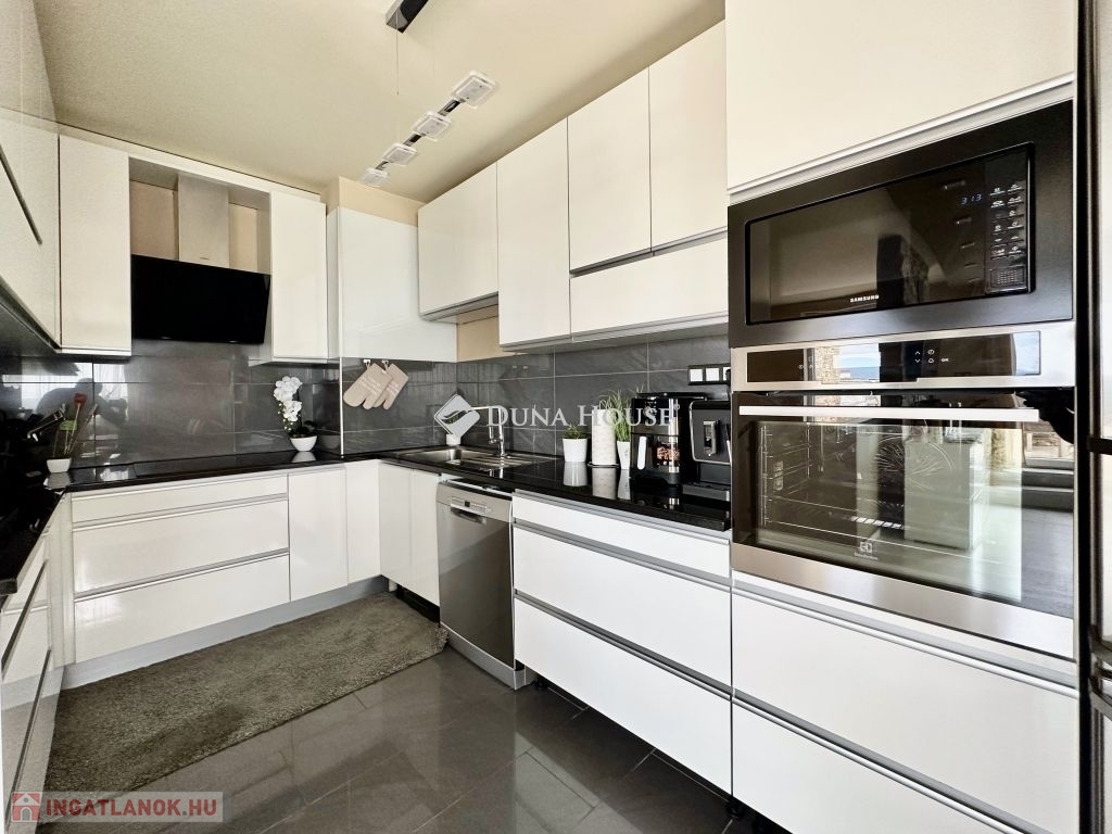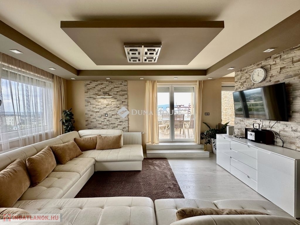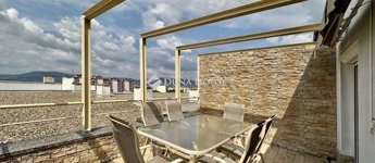 Eladó panorámás, modern lakás tetőterasszal Fellbach lakópark, PécsExkluzív lehetőség a közkedvelt Fellbach lakóparkban: eladásra kínálunk egy kiváló elrendezésű, világos, modern kialakítású téglalakást, páratlan kilátással a Mecsekre. Az ingatlan egy lifttel ellátott társasház legfelső szintjén található, igényes, rendezett környezetben.Főbb jellemzők:Tágas amerikai konyhás nappaliNagyméretű tetőterasz elektromos árnyékolóvalKét külön nyíló hálószobaFürdőszoba + külön WCMinden helyiség klimatizáltSaját, zárható tárolóTávfűtés egyedi mérővelParkolás közvetlenül az épület előtt, mindkét irányból megközelíthetőenA lakás modern burkolatokkal, stílusos belsőépítészeti megoldásokkal, kiváló természetes fényviszonyokkal rendelkezik. Ideális választás azok számára, akik igényes, jól megközelíthető, nyugodt környezetben keresnek prémium ingatlant. További információért és megtekintésért keressen bizalommal!