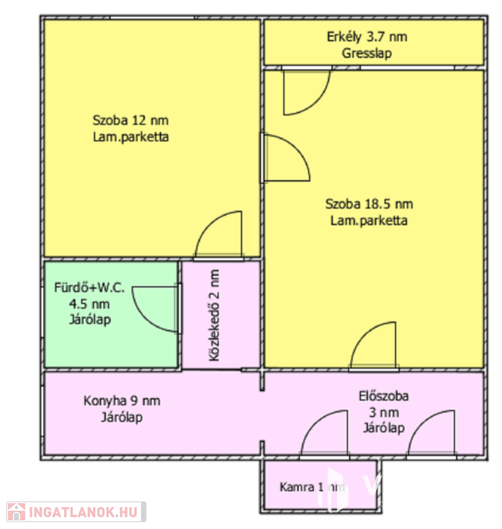 Helyiségei: 2 szoba, konyha, kamra, fürdőszoba, előszoba, erkély.