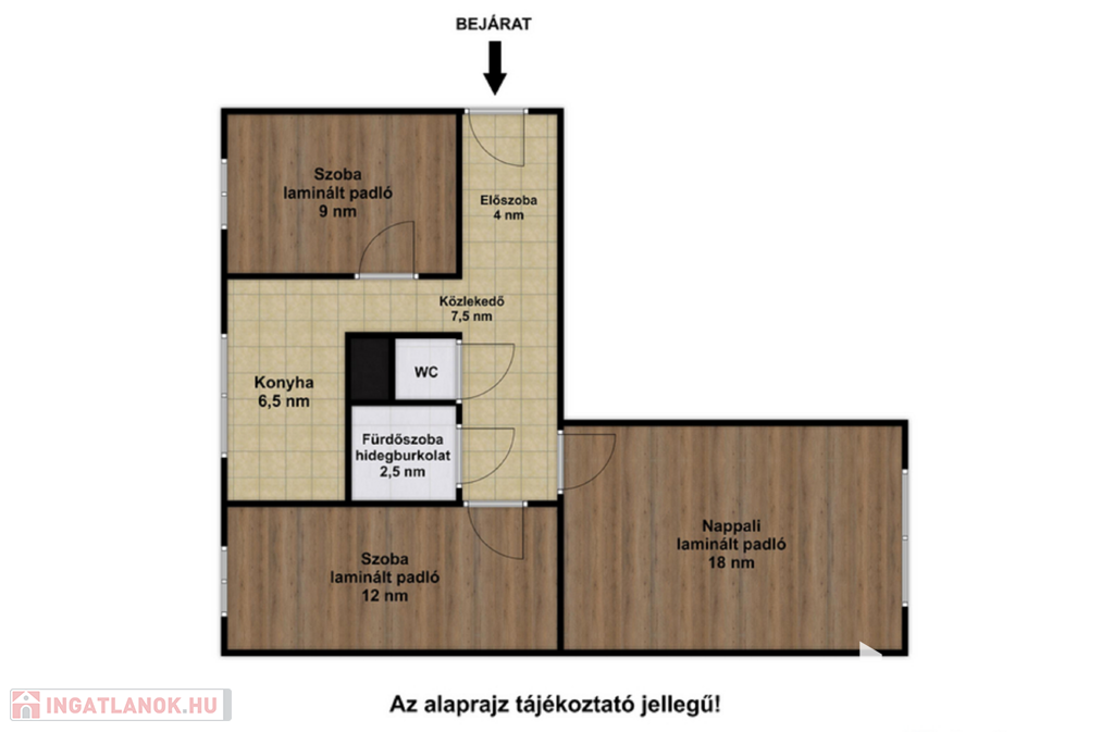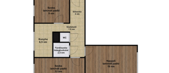 - Laminált padló a szobákban, hidegburkolat a többi helyiségben.