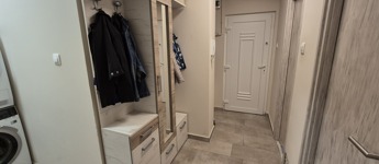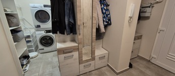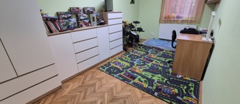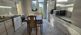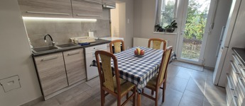 A lakás jó elosztású: 5 külön bejáratú szoba, erkély, külön háztartási helyiség, étkező konyha – kijárattal a kertbe, ahol saját kertész van. Napfényes, kelet-nyugat tájolású. Az ingatlan alacsony rezsiköltségű: a gázszámla havi elosztással 10.000 Ft (főzőgáz és meleg vízzel együtt), közös költség 15.000 Ft. A 8 lakásos, rendezett társasház lépcsőházának összes nyílászárója is új, műanyagra cserélt. Saját tároló tartozik a lakáshoz. A zöld, csendes környezetben a szomszédságban megtalálható buszmegálló, boltok, iskola, óvoda.