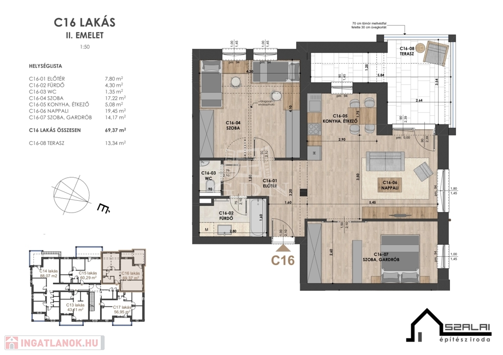 Szombathely kedvelt környékén, a belvároshoz közel, ám még is kellemes családi házas övezetben, még elérhetők új építésű lakások. Ez a projekt a Hunyadi János út-Vitéz utca-Szőllősi sétány által határolt területen kerül megvalósításra három ütemben. Az első két ütem már átadásra került. Teremgarázsban kialakított parkolóhelyeken kívül, felszíni parkolók vásárolhatók az ingatlanokhoz (teremgarázs nettó 7 millió Ft, felszíni parkoló nettó 1.2 millió Ft). A bekerített, sorompóval lezárt terület három gépkocsi ki-behajtóval fog rendelkezni, a Hunyadi és a Vitéz utca felé pozicionálva. Gyalogos sétány biztosítja a kijutást a Szőllősi sétányra. Magas műszaki tartalommal épített lakások melegét házközponti fűtés látja el, lakásonkénti hőmennyiség mérővel, padlófűtéses hőleadással. Ezenkívül hűtő- fűtő klíma biztosítja a kellemes hőmérsékletet az ingatlanokban. Az itt épülő lakások 57-88 m2 -es 3-4 szobás kialakításúak. Minden igényt kielégítő felszereltségű erkélyes, teraszos ingatlanok alkalmasak nagy családosoknak, pároknak, befektetőknek egyaránt. Beltéri ajtók, szaniterek, burkolatok választhatók. A lakópark akadálymentesített, a földszinten közös kerékpártároló, valamint szintenként saját tárolók is elérhetők. A hirdetésben szereplő lakás főbb paraméterei: Második emelet 16. A lakás 69 m2, terasza 14 m2.
