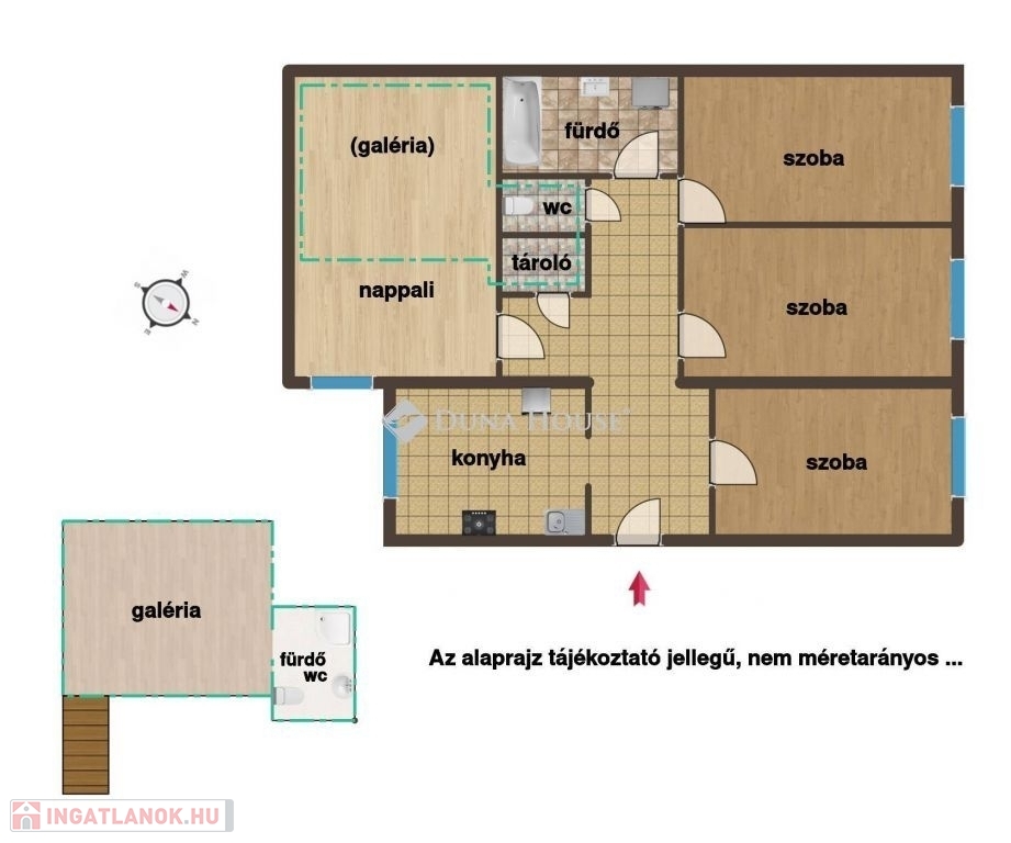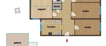 A lakásba a kapuszínből jutunk be, előszobájából nyílik a három utcafronti szoba, a fürdő-wc, a ház belső udvarára tájolt a konyha és a galériázott nappali, a galériából nyílik egy kisebb, zuhanyzós fürdő-wc. (összesen 80 m2 + a galériaszint). Az ingatlan 2010 és 2015 között teljes felújításon esett át, műszakilag is korszerűsítve lett, esztétikailag is hibátlan állapotban van. Fűtését gáz-cirkó kazán biztosítja, alternatívaként hűtő-fűtő klímaberendezést is felszereltek.