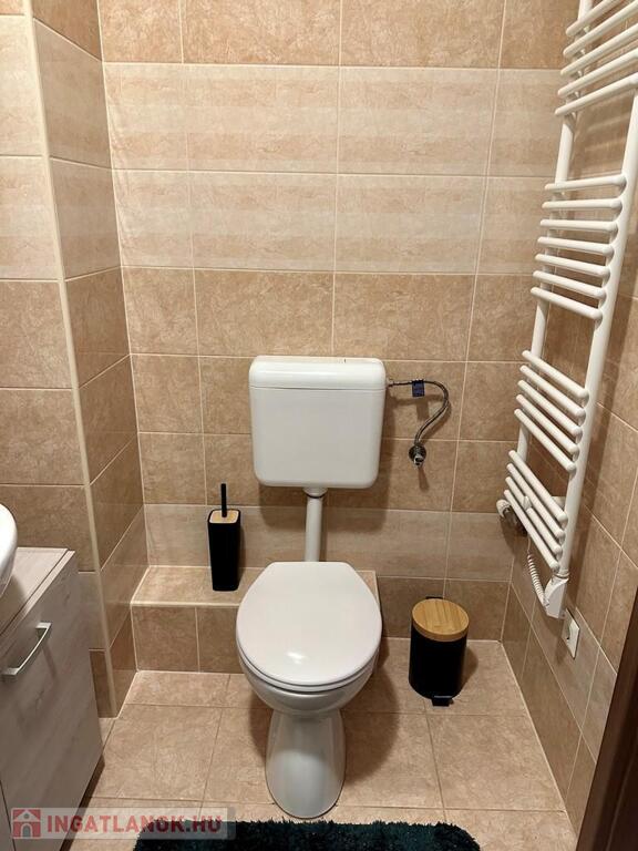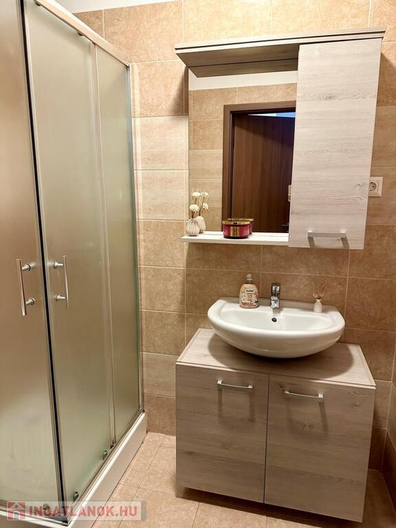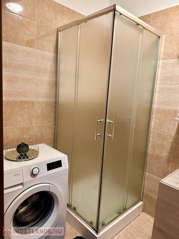 a fürdőszoba igényes burkolatokkal, zuhanykabinnal került kialakításra.