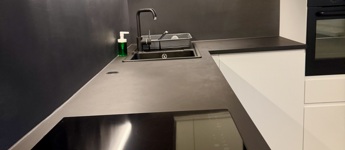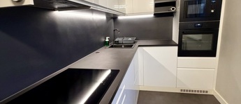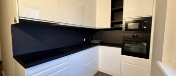 A konyha különösen figyelemreméltó: minőségi konyhabútor, praktikus elrendezéssel, beépített gépekkel (sütő, főzőlap, mikró, mosogatógép), amely így azonnal használatra kész.