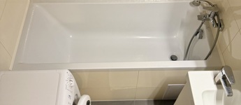 A fürdő és a WC külön helyiségben található, mindkettő modern burkolatokkal, Grohe-szerelvényekkel, a szellőzés elektromos vezérléssel lett megoldva.