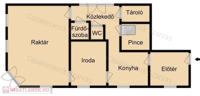 - Alapterülete nettó 141 m2: előtér, konyha, iroda, raktár, közlekedő, tároló, WC, fürdőszoba illemhelyiséggel, pince található benne.