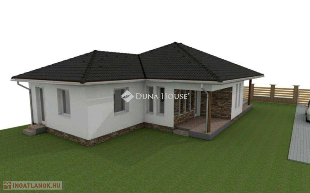Kialakítása: 3 tágas szoba, nappali, konyha, előtér, közlekedő, fürdő, külön wc, háztartási helyiség, fedett terasz 19 m2.