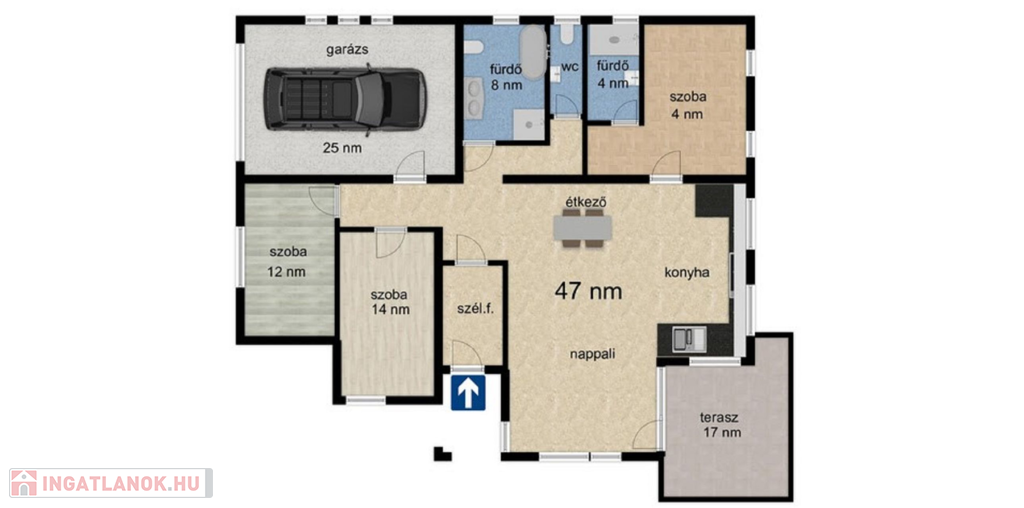 - 144. nm alapterület,17. nm terasz,4. nm fedett bejáró.