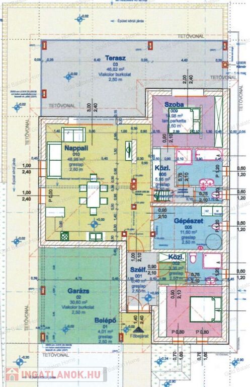 - nettó alapterület: 115,83 nm, fedett terasz 46,82 m2, nyitott garázs, 30,60 m2, telek mérete: 940 nm (kb. 21*45 m)