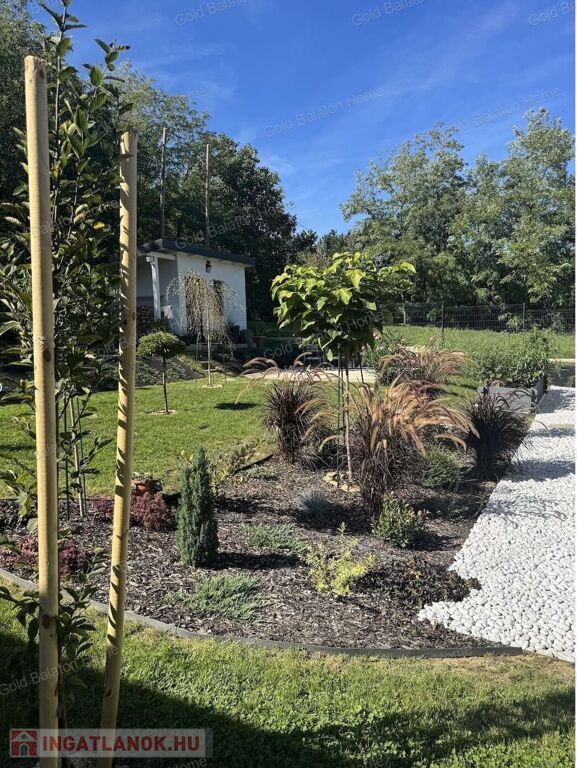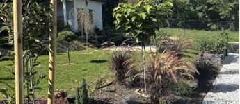 - gondozott kert különböző dísznövényekkel, bokrokkal, fákkal